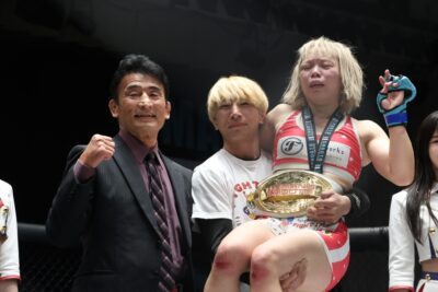 【写真】5Rフルに組み続けた青野。試合後は義理の父で初代修斗王者の渡部優一さん、夫でもある渡部修斗と3人で記念撮影に収まった。(C)MMAPLANET <修斗世界女子アトム級王座決定戦/5分5R> 青野ひかる(日本) Def.3-…