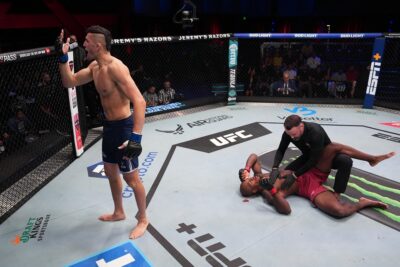 ケージ中央に戻ったロウストンは、ニータップで組むとシングルレッグに切り替えて、ドライブから尻もちを着かせた。しかしホームスが足を持たれたままバックを狙う。ホームスをケージに押し込んだロウストンは、立ち上がる相手にヒザ蹴りを放つも、これがローブローに。再開後、ロウストンが右ミドルを決める。さらに右ストレートを2発当てたあと、下がるホームスの顔面に右を叩き込み、ダウンを奪う。一度亀になってから立ち上がったホームスにパンチの連打を浴びせ、さらにヒザとヒジでダメージを与え、パンチで倒しレフェリーストップを呼び込んだ。