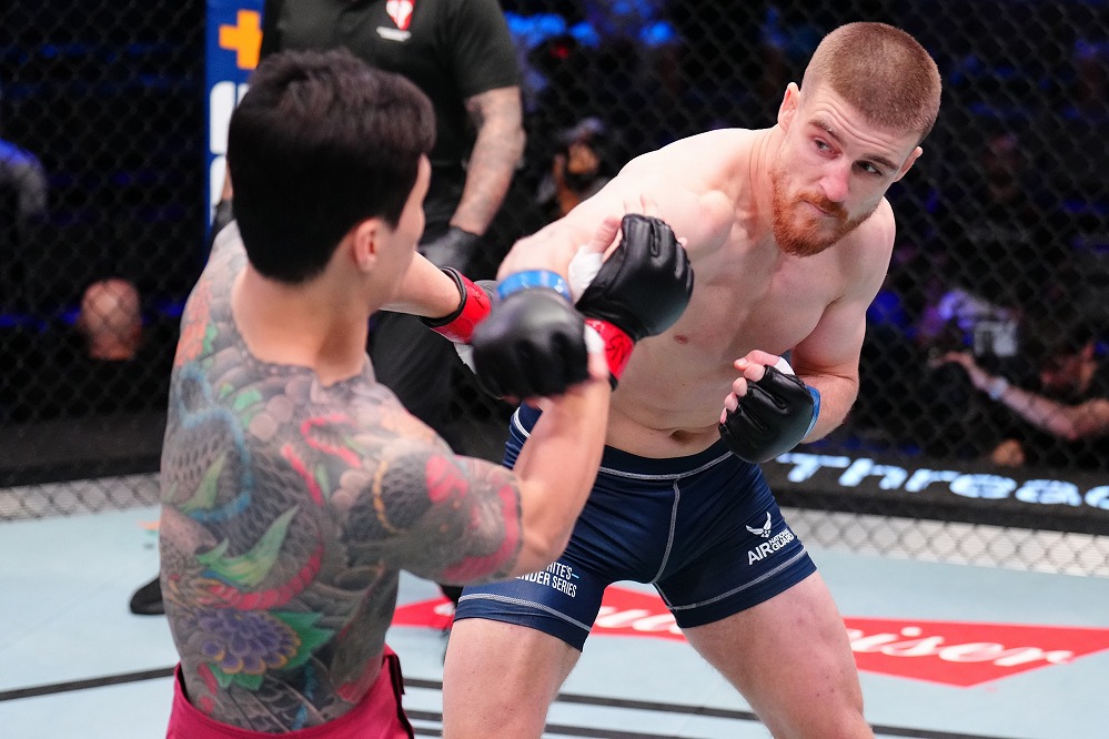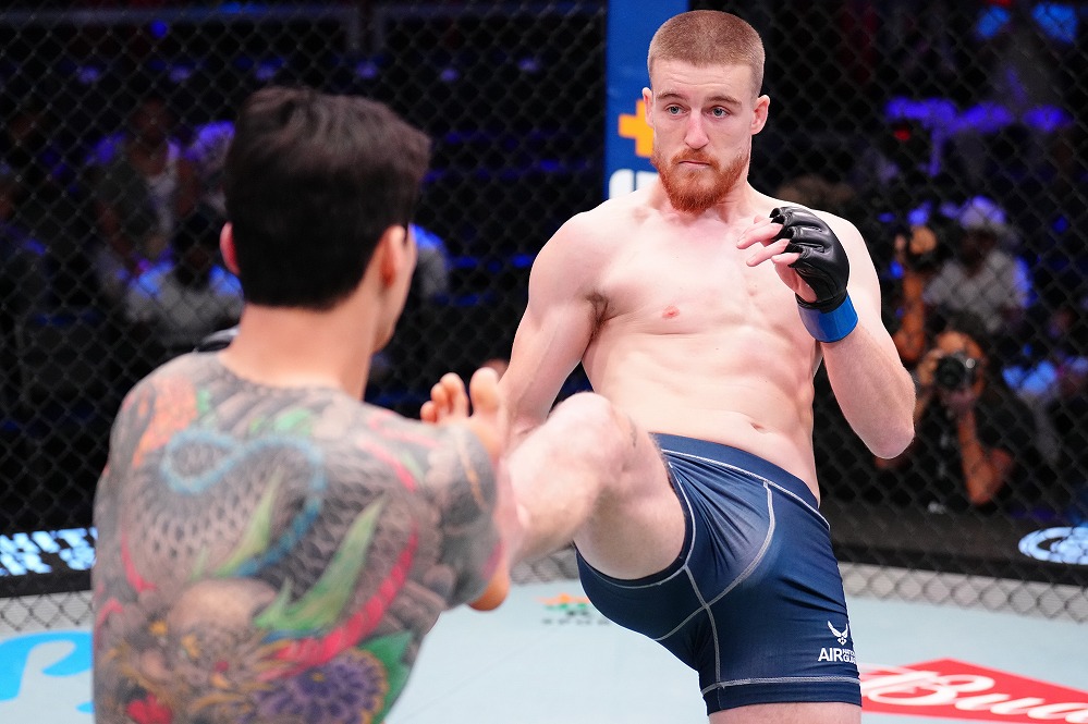 長身、フレームでも上回るマコーリーがローから左を狙う。スイッチスタンスのマコーリーはファン・インスのステップインに左を合わせる。左ハイを蹴り、ローをかわしたマコーリーが右ジャブを伸ばす。アップライトで前に出て右を届かせたファン・インスが、右リードフックをかわす。マコーリーは左右のローを蹴り、ファン・インスもローを返す。拳の攻撃が少ない両者、マコーリーがオーソから右を伸ばした。