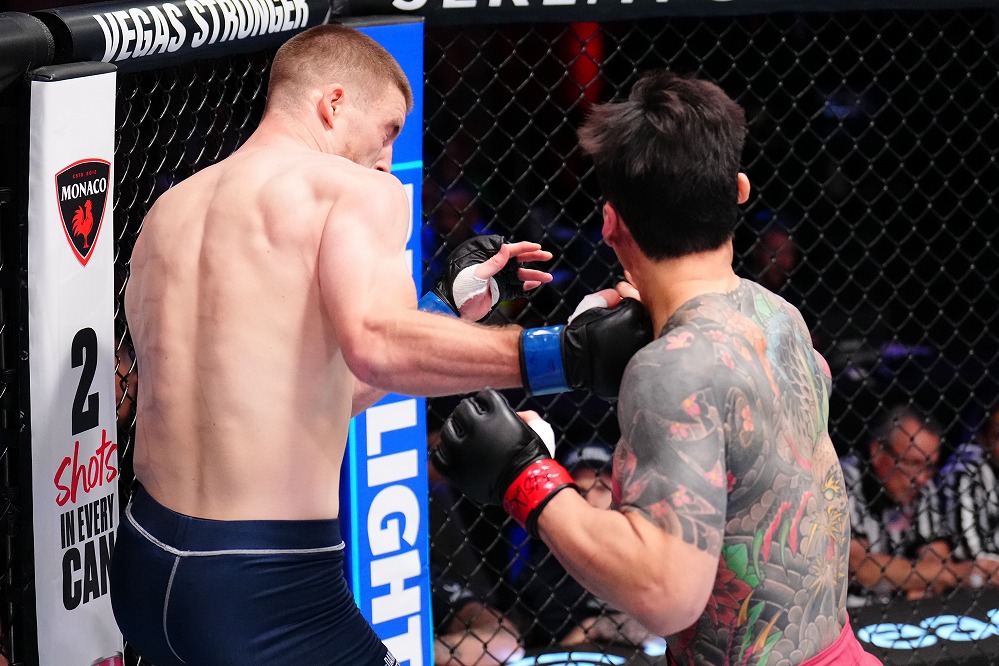 2R、両者にケージ際まで下がれと何度か注意が入るが、ファン・インスが聞かずファイトが始まる。すぐに距離を詰めていくファン・インスは右フックを受けそうになり、自らの右ミドルで姿勢を乱す。ファン・インスは左ステップフックを入れるが、次の手がなく右を受ける。続いて右で前に出たファン・インスは、組まれてケージに押し込まれる。マコーリーは右エルボーを当て、回って離れたファン・インスに前蹴り、関節蹴りを繰り出す。