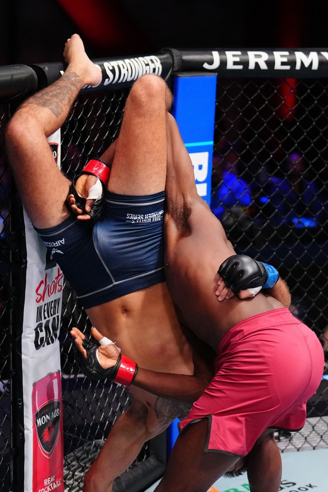背中を見せたリヴィングストンが立ち上がって正対しようとする。ギャントは右をエルボーを打ち込み、ダブルレッグからリフトアップ。ダメージを狙ってか頭から落とそうとしたギャント。そのままサイドで抑えシングル狙いをスプロールしてギロチンをセットする。