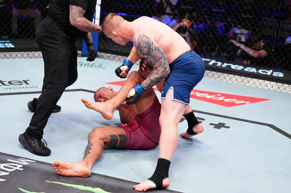 右前蹴りをまず蹴ったアリー。続く右カーフでバラニエフスキーがバランスを崩す。アリーはリラックスした様子で、足を使って左を振るう。その刹那、バラニエフスキーが右オーバーハンドを合わせる。後方に倒れたアリーに、追撃をパウンドを落としたバラニエフスキーが大番狂わせを起こした。