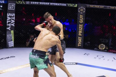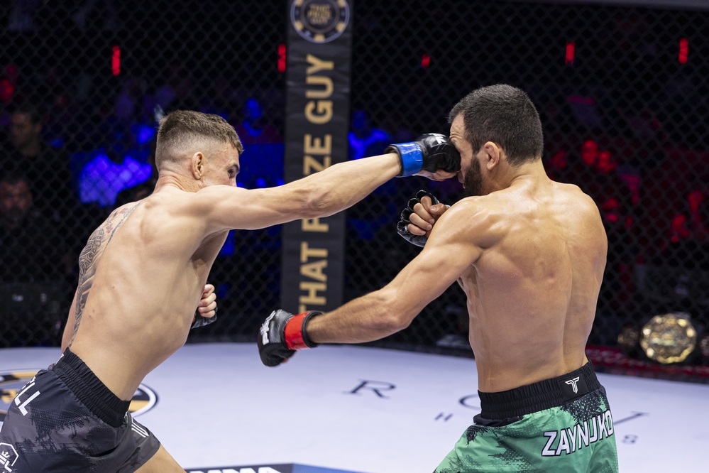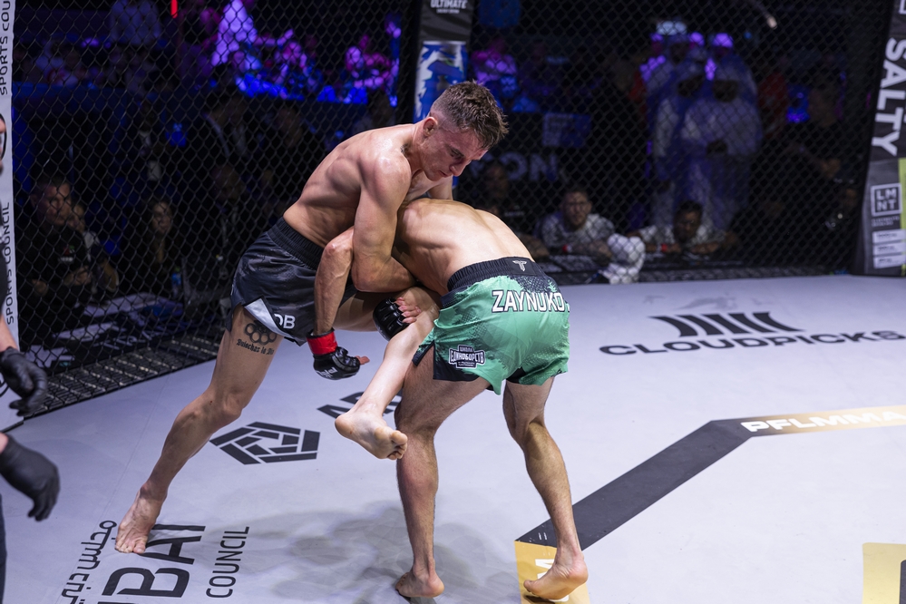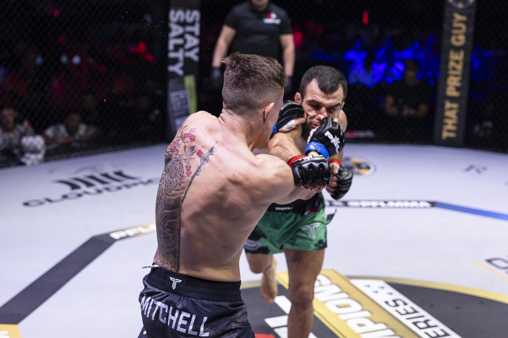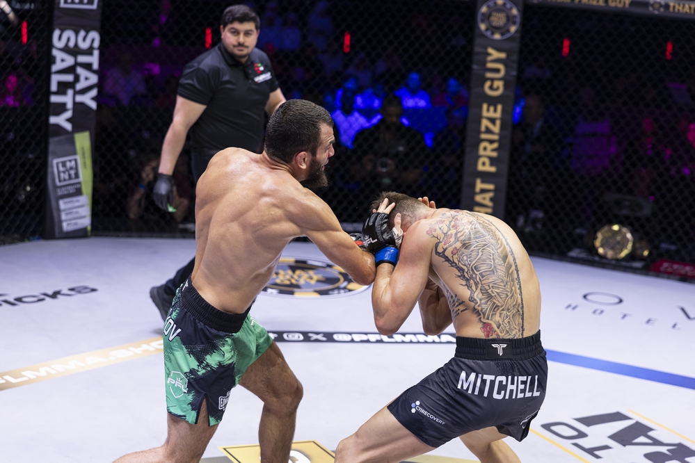 【写真】ミッチェルの右カーフに手を焼いたザイヌコフだがTDを混ぜた試合運びで勝ちを掴んだ(C)PFL