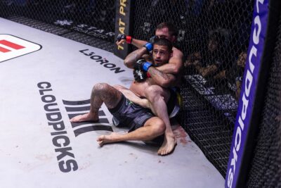 マゴメドフはここもボディトライアングルに捕らえ、左腕を喉下に。手首を取って切ったセルジオは、肩固め狙いに足を戻し三角狙いからアップキックへ。レッスルアップ&シングルをマゴメドフががぶってバックに。前方に落とされそうになったマゴメドフが、着地してヒザ蹴りを見せる。ボディにサイドキックのセルジオが、バックを許した思った刹那――スピニングバックエルボーを決める。