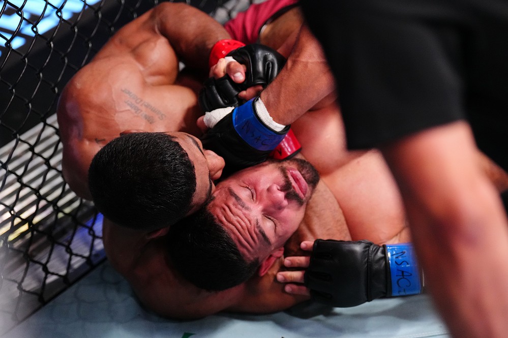 立ち上がるジアス。ヘドリックはバックからパンチを打ち込み、正対したジアスに対してコンビネーションを放つ。距離を取ったジアスが組んでバックへ。バックマウントを奪いながらグラウンドに持ち込む。フェイスクランクで仰向けにさせてマウントを狙うジアス。耐えるヘドリックにパンチを落としながら、ノースサウスからサイドを奪ってパウンド→バックマウントに。右腕を首に回し、RNCで絞め上げてタップを奪った。