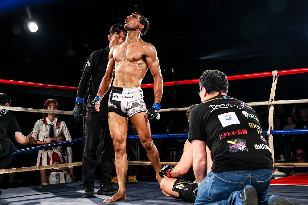 2R、デイネッシュがサウスポーに構える。左ストレートを伸ばしたデイネッシュは、右スピニングバックキックを繰り出す。島村のシングルレッグをスプロールしたデイネッシュは、パンチとヒジで削る。バックマウントを奪ったデイネッシュが左腕を首に回すも、絞め上げることはできない。ならばとボディトライアングル、バックマウントから殴り続けるデイネッシュ。島村の動きが止まり、レフェリーが試合をストップ。デイネッシュにとっては昨年7月、TOMAに敗れて以来、1年3カ月振りの復帰戦を勝利で飾った。