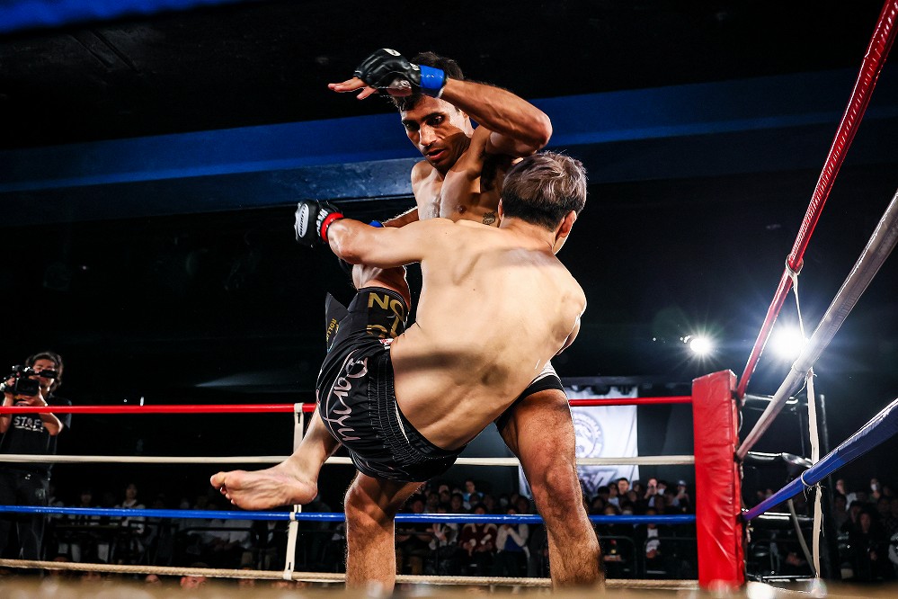 サウスポーの島村が右を伸ばす。デイネッシュの左ジャブに右を被せる島村。しかしデイネッシュが島村にロープを背負わせ、右ストレートを浴びせた。組んできた島村に、首相撲からヒザを突き刺したデイネッシュ。島村がワンツーをかわしてバックに回る。