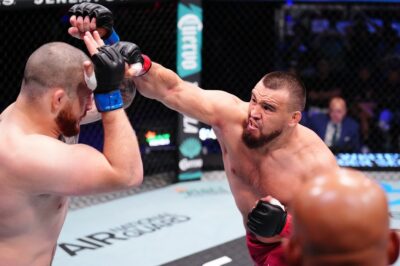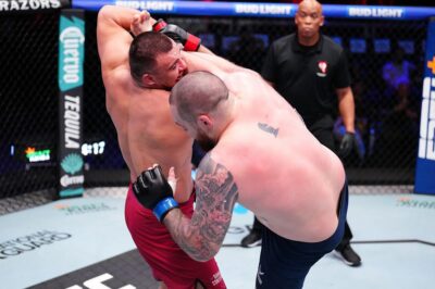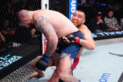 バックコントロールしようとするヌフティラエフ。正対したレカはヌフティラエフをケージに詰めて左のヒジからパンチをまとめる。ヌフティラエフも必死にシングルレッグに入るが、レカがそれを潰して最終的にサイドポジションで抑え込む。