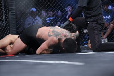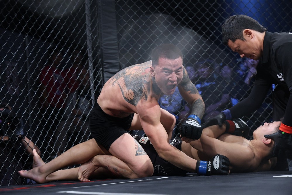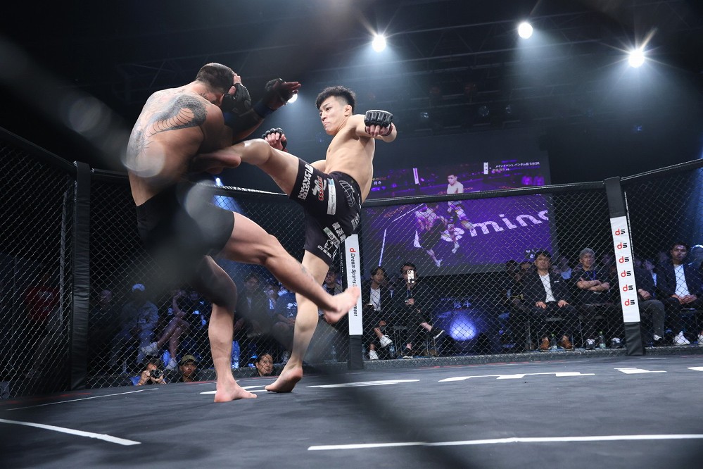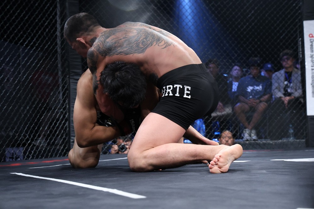 サウスポーの野瀬が体を振って距離を詰める。右カーフ、左ミドルを当て、さらに左オーバーハンドから組みついた。ガブったシンバートルがギロチンで引き込む。左腕で絞めつつリバーサルしたシンバートルは、野瀬の両足を押さえ、そのまま絞め落とした。