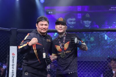 放心状態でケージをあとにする野瀬。衝撃の80秒勝利となったシンバートルは関係者への感謝を述べた。