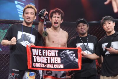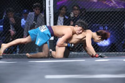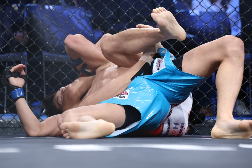 ここは福島も正対してパンチを連打する。砂辺が立つところにパンチを打ち込む福島。砂辺もケージを背にして真っ向から撃ち合う。砂辺がボディロックからテイクダウンを奪うとバックに回ってRNCへ。これががっちりと極まり、砂辺が福島から一本勝ちを収めた。