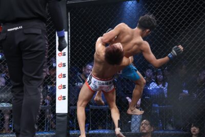 サウスポーの福島が右のアウトロー、左のスーパーマンパンチから組みつく。ここは砂辺が四つの攻防からテイクダウンを奪い、立ち上がった福島のバックにつく。砂辺は福島を持ち上げて後方にスープレックスで投げるが、福島はグラウンドコントロールを許さない。逆に福島が正対して砂辺をテイクダウンしてバックへ。