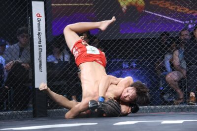 続くニシダのテイクダウンを切ってバックに回り、亀になるニシダにパンチを入れる。ここから畠山は両足をフックし、左足を深く入れて四の字フックへ。畠山がバックキープを続けRNCを狙い、試合終了となった。判定は2-1と割れたものの、畠山が勝利。試合後は田上こゆるへの挑戦をアピールし“あの名作に格闘技の技を取り入れてみた”という一発ギャグで試合を締めた。