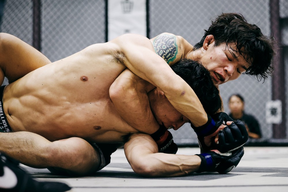 すかさず高岡がシングルレッグで組み、ダブルレッグに切り替えてドライブ。ケージ際で尻もちを着かせるとバックに回る。パウンドで削りつつRNCを狙う高岡。大竹は正対するも、高岡がバックコントロールを選択した。再び腕を首に回していく高岡は、バックマウントを奪取して初回を終えた。