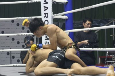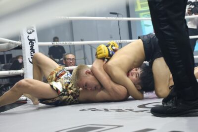 新田がじりじりと前に出る。松本は左フックから右ストレートにつなげる。新田はパンチからローと左ミドル、松本が組んでテイクダウンを奪った新田が上四方に回ってヒザ蹴りを入れる。