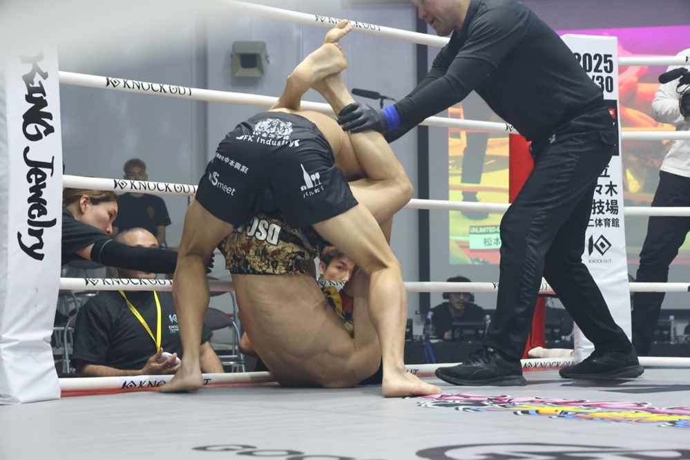 ブレイク後、新田は右ロー。松本は左フックから右ストレート、ダブルレッグでテイクダウンを奪うと、新田はクローズドガードでブレイクを待つ。試合がスタンドに戻ると松本は右ストレート、左フックから組みつく。