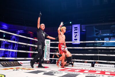 なんとかモラリが立ち上がって試合再開となるが、原口がパンチから左ミドル、三日月蹴り、左ハイで猛攻。モラリも右フックとスピニングバックキックを狙うが当たらない。原口は落ち着いて左ミドルとストレート、インカーフ。これをもらったところで、モラリが自ら背中を向けて戦意喪失。原口がモラリの心を折るKO勝利で、トーナメント3回戦に駒を進めた。