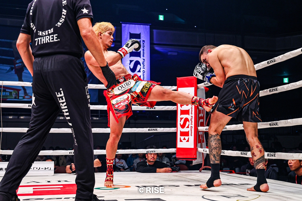 【GLORY×RISE】原口健飛が左の三日月蹴りでダウンを重ね、モラリを戦意喪失に追い込む