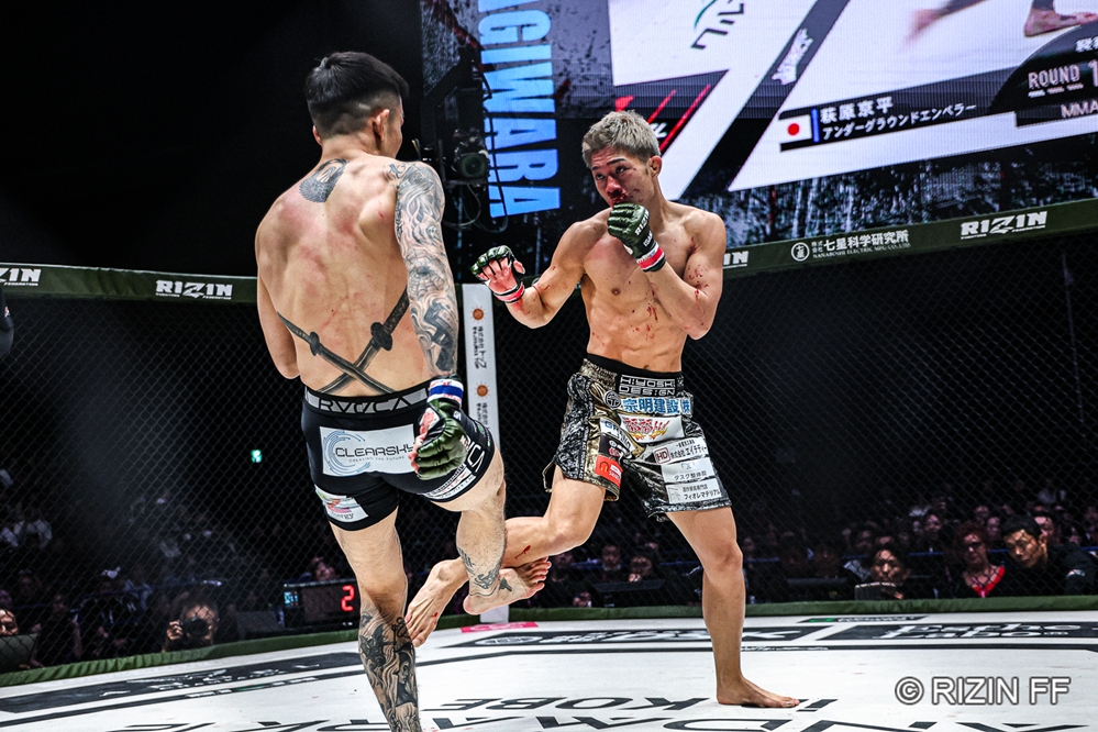 サウスポーの秋元に対し、萩原が右手を伸ばしながらインカーフを蹴る。秋元はじりじりと前に出て左ストレートを伸ばす。萩原はジャブとインカーフ、秋元は左ストレートからシングルレッグに入る。萩原がケージに体を預けてテイクダウンディフェンスして両者が離れる。
