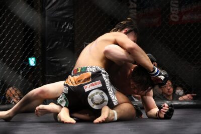 下田がシングルレッグに組み替えると、ギロチンで引き込む中桐。しかし下田がバックに回り、立ち上がり正対した中桐をボディロックで捕らえている。ダブルレッグで両足を引き抜きながら、バックへ。中桐が正対するとシングルレッグ、ダブルレッグと揺さぶっていく。中桐はハーフネルソンで切り返し、下田に背中を着かせてからバックに回ってラウンド終了のゴングを聞いた。
