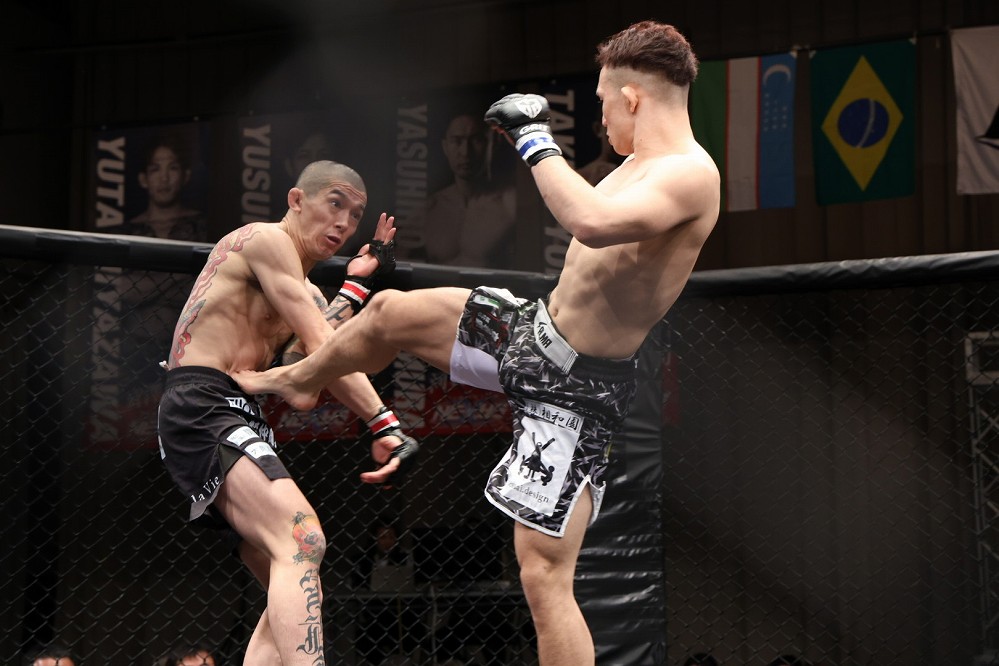 蹴り合いからパンチの交錯で須藤が尻もちを着いた。シッティングガードの須藤に対し、ローを蹴る横山。須藤は立ち上がってすぐシングルレッグから引き込み、横山の左足を狙う。足を抜いた横山が立ち上がると、須藤もスタンドに戻った。横山はローを当て、須藤の右に左ストレートを合わせる。やはり足を取って引き込む須藤だが、横山が足関節を潰す。須藤は下から三角、外れると横山の左腕をキムラで抱えて初回を終えた。