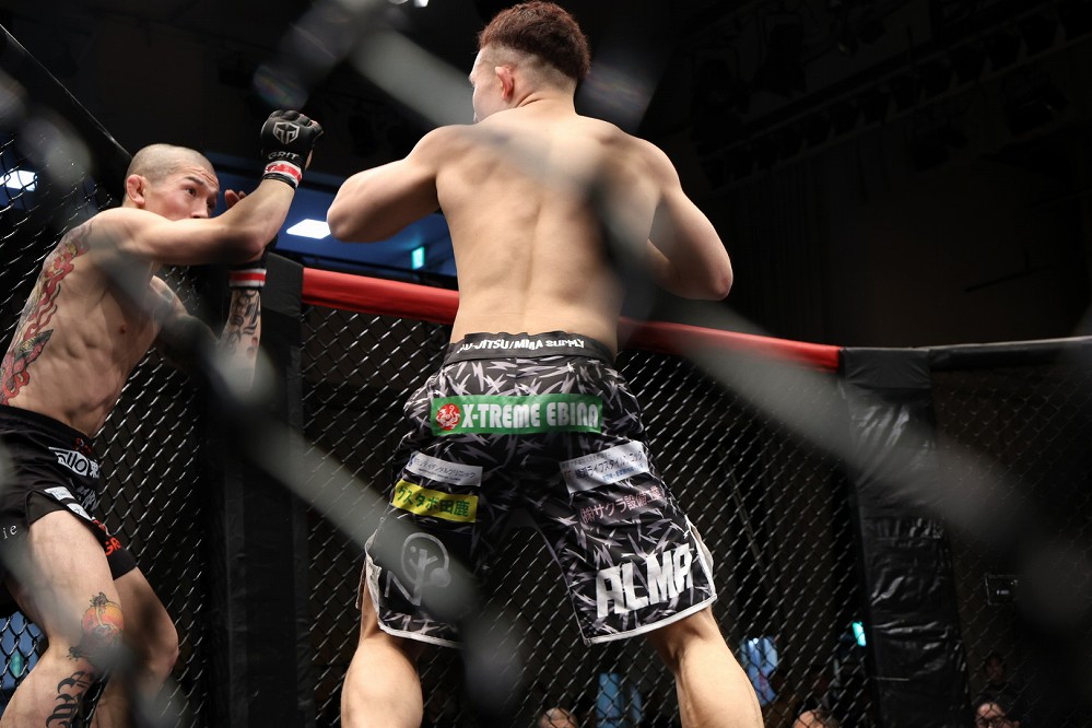 須藤は試合を続行。再開後、互いに蹴り合いから距離を詰めていく。横山の胴廻し回転蹴りをかわした須藤がパウンドを連打する。横山は草刈りから立ち上がり、須藤もスタンドへ。残り1分、須藤がシングルレッグから引き込むが、足を取り切れずボトムに。横山がパチンを連打すると、須藤もシングルレッグを狙うがガブられてしまった。