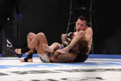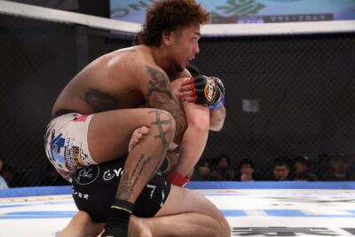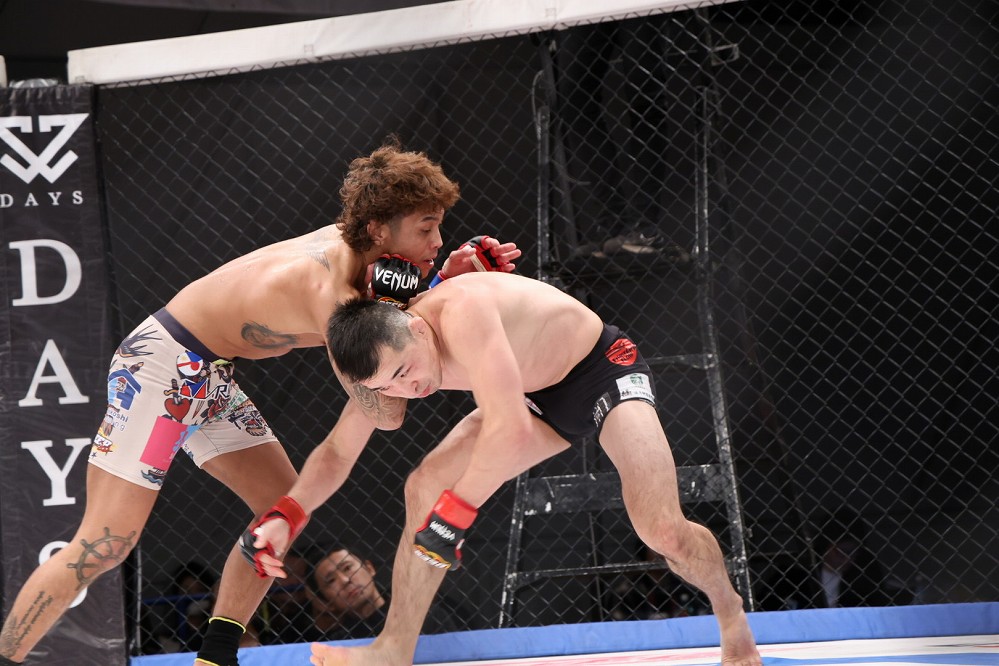 神酒が前蹴りをボディに突き刺した。ニータップでナカムラを崩し、バックを狙うが切り返されてボトムに。両足を腰骨に当て、ナカムラを抱えてパンチを打ち込む。ナカムラも右を打ち込み、三角絞めをかわしてバックへ回る。ボディトライアングルから首に手を回すも取りきることはできず。ならばと神酒の右腕を狙うが、下になってしまった。左腕を首に回してギロチンの体勢のまま試合終了のゴングを聞いた。