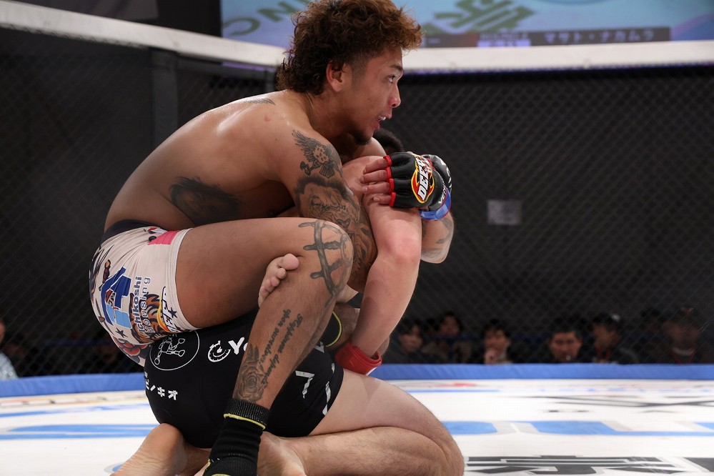 スタンドで再開後、ナカムラの右ストレートを受けた神酒がマットに手を着く。打撃のプレスを強めるナカムラの右ヒジをかわした神酒がグラウンドに持ち込み、ワンフック&たすき掛けでバックをキープする。左足をナカムラの右足にフックする神酒。ナカムラが反転するとトップに回った。パンチで削ってバックマウントを奪取し、腕十字→マウントを奪って初回を終えた。