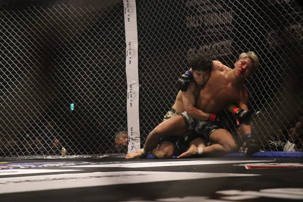 やはりルキヤは正対&右ヒジを狙うも、ボディロックで崩されてしまう。ルキヤに背中を着かせ、さらにバックコントロールで動きを潰す。またもスタンド→右ヒジ&正対の際に崩されてしまうルキヤ。南は左腕を枕に、しっかりと背中を着かせて削り、連打を浴びせてレフェリーストップを呼び込んだ。