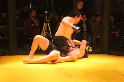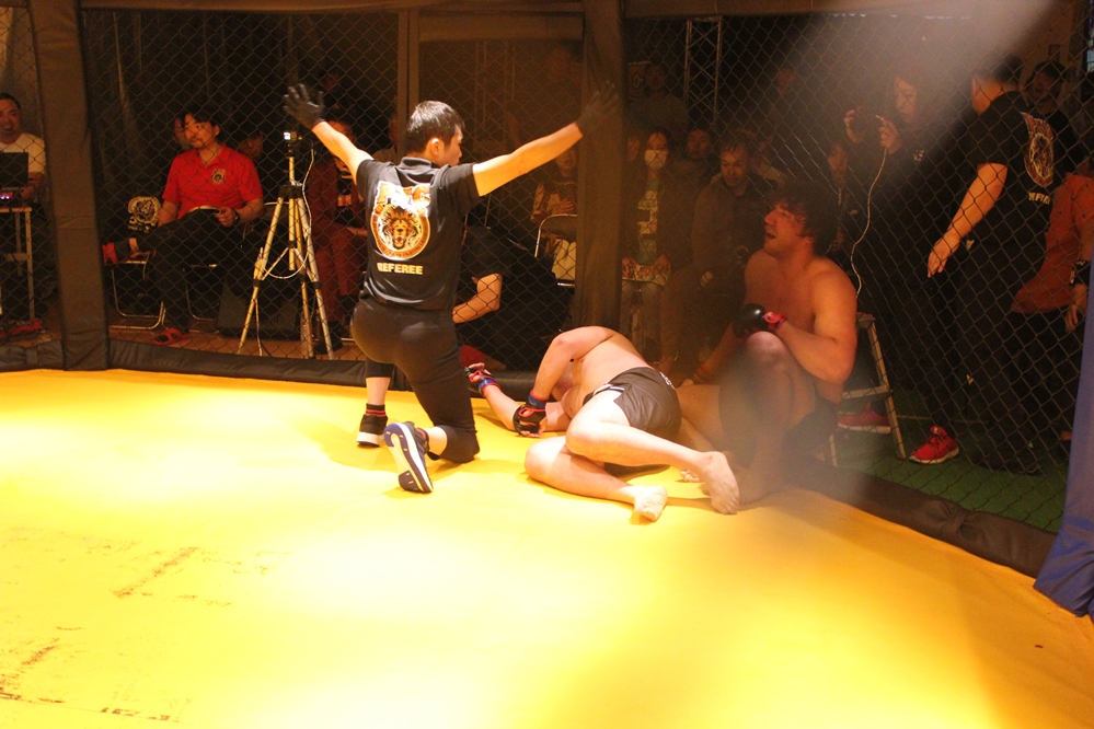 ペイトンは左足をカタナマンの右腕にひっかけ、右腕でカタナマンの右腕を内側から持って左手で鉄槌とヒジを連打する。カタナマンも正対するが、ペイトンは三角絞めの形を作ってパンチを入れ続ける。カタナマンはペイトンの三角絞めを外し、足を担ぐようにパスガードすると、背中を見せるペイトンのバックについてマウントへ。ガードを固めるペイトンにパンチを連打するがラウンド終了となる。