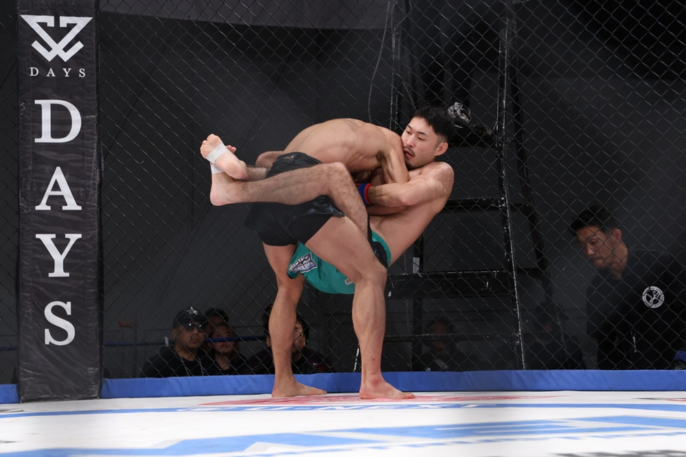 ここは河村が足をフックさせずに上のポジションを取るが、石司もすぐに立ち上がる。ここから組みの攻防になると石司がテイクダウンを狙い、河村がバックへ。スクランブルの攻防から河村が上になり、石司の右足に足関節を狙いながら、右足で石司の顔面を蹴る。河村はカーフスライサーの形でバックを狙う。