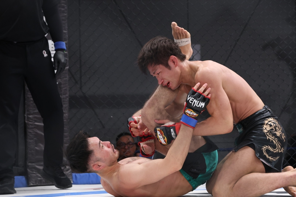 石司がシングルバックの態勢になると河村が腰を抜いて後ろ袈裟へ。河村が首に手を巻いてギロチンを狙うが石司が正対してトップキープし、立ち上がる。ブレイク後、石司が右ローを蹴って右ストレート。河村も右を返して、左フックまでつなげる。ガードを固める石司に組んだ河村はここも引き込んで三角絞めへ。河村は足をクラッチしたまま細かいパンチを入れ、石司は立ち上がって河村の足を外す。石司は河村の蹴り上げを捌きながら、インサイドガードに戻ってパンチを入れて立ち上がる。