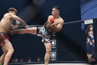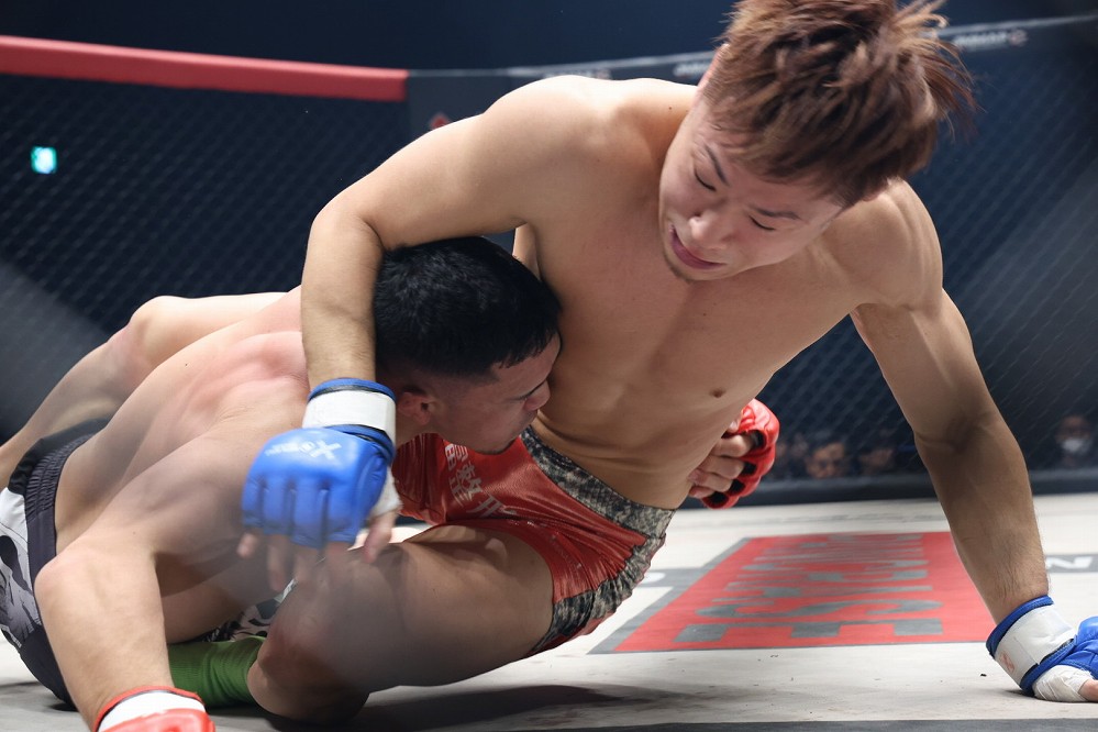 2R開始早々、粕谷が左ボディストレート、右ボディフックを当てる。ISAOも右フックを返した。粕谷の左を受けてグラついたISAOがシングルレッグへ。これをガブって切り返した粕谷は、反応が送れたISAOのバックに回って即、左腕を首に回す。ISAOを仰向けにさせ、パームトゥパームで絞め上げてタップを奪った。