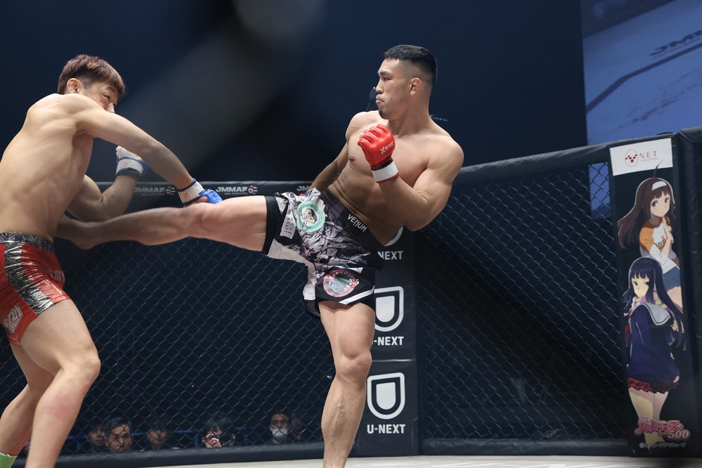 粕谷に休憩が与えられ、試合が再開される。ISAOは粕谷の右フックに右テンカオを合わせる。続けてテイクダウンを奪ったISAOが、粕谷に背中を着かせた。粕谷はクローズドガードへ。ISAOがトップから削っていくと、粕谷はケージへ下がっていく。さらに立ち上がろうとした粕谷に対し、一度立ち上がったISAOが再び上から押さえ込んだ。