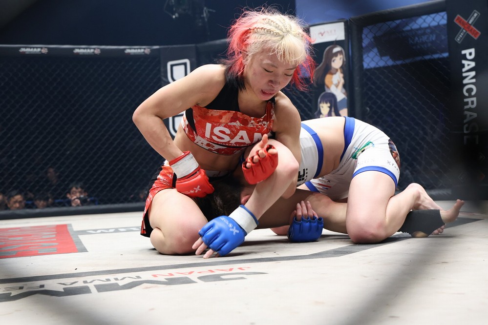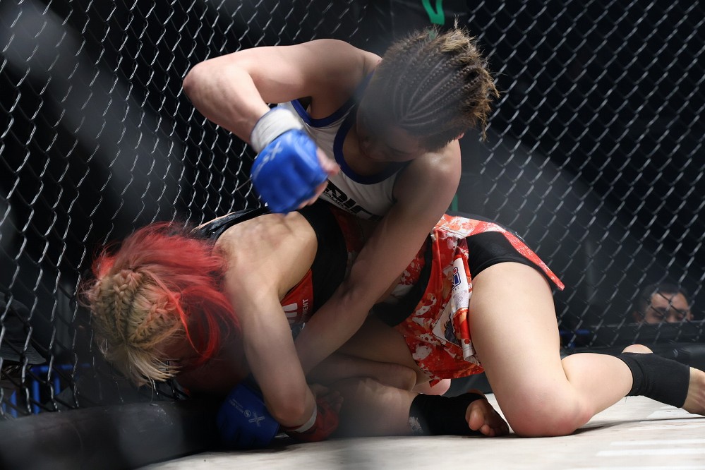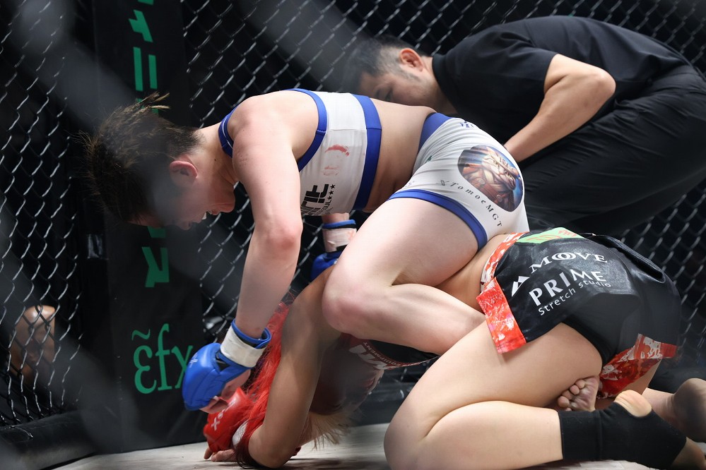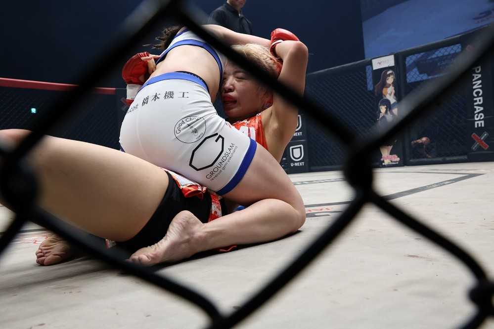 【写真】腕十字やRNCを狙うだけでなく、とにかく殴り続けた本野。KARENAはポジションを取り返すことができなかった(C)MMAPLANET