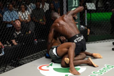 頭を上げてエスペランサは、完全にガスアウト状態でヒザに手を置く場面も。ここで逆にンチャラが組んで、ケージに押し込んで削っていく。ついにはダブルレッグでテイクダウンを決めたンチャラが、パウンドを連打する。完全にガスアウトのエスペランサはクローズドでラウンド終了を迎えた。