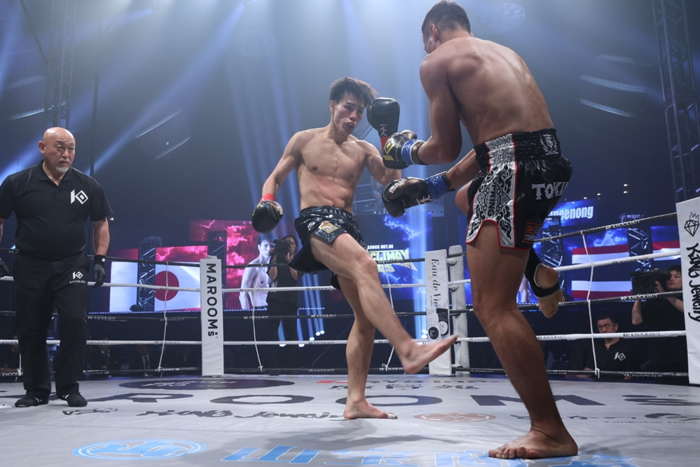 【写真】シッティチャイに左ミドルを蹴られても、必ずインロー・カーフを蹴り返し続けた海人。11月にケール、12月にシッティチャイを下し、ONEへの挑戦を明言した(C)MMAPLANET