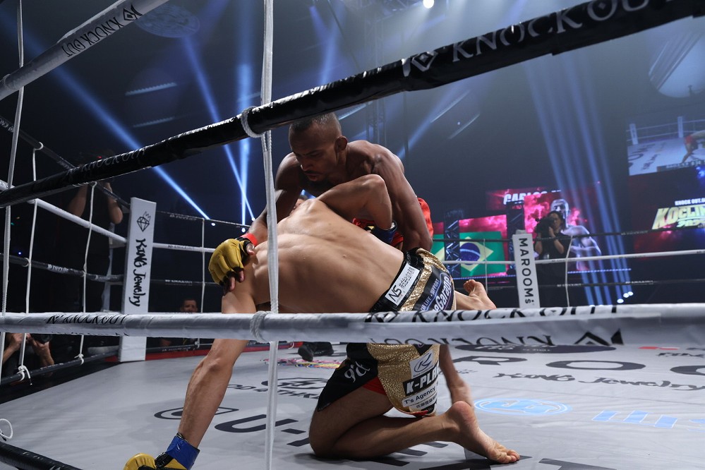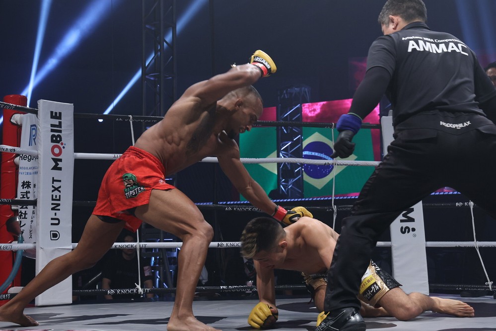 カウンターを食らってダウンした有川に、モタはジャンプしてフットスタンプ。有川が亀になるとモタはパンチを浴びせる。立ち上がるもモタの左をもらってフラつく有川。左ミドルを受け、ダブルレッグに右ヒザを合わされてしまう。うずくまったところにモタの連打を浴びてレフェリーストップとなった。