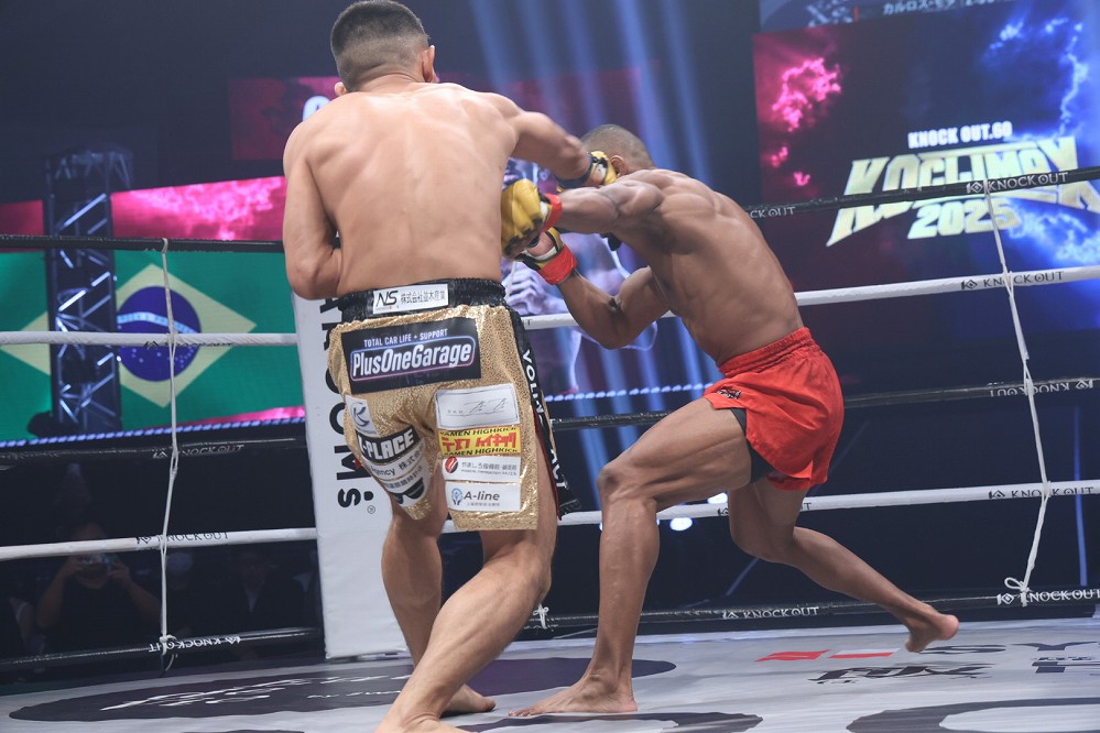 互いにスイッチしながらローを蹴り合うなか、有川が右カウンターを当ててモタを下がらせるも、自分もモタの右を受けてバランスを崩した。モタのパンチに右ローを合わせる有川。モタは有川の上げた右足をキャッチし、尻もちを着かせてから顔面に右ヒザを突き刺す。すぐに立ち上がった有川は打ち合いへ。モタは有川の右ストレートをかわし、ニータップで尻もちを着かせた。ガブりながら立ち上がった有川に、再び尻もちを着かせて初回を終えた。