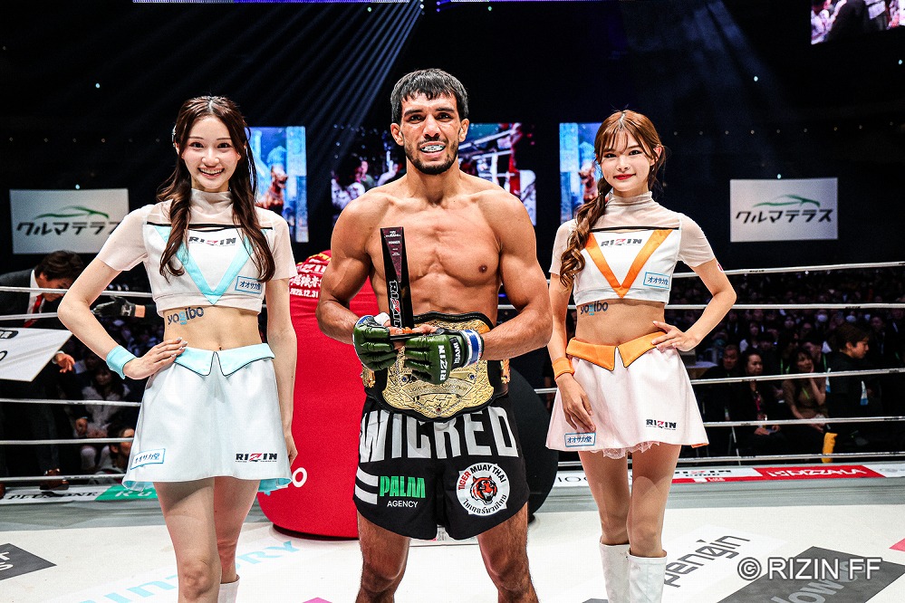 続くダブルレッグ・アテンプトに、ノジモフが右ヒザを合わせる。この一発でサトシが失神し、ノジモフが新RIZINライト級王者に輝いた。衝撃のKO勝ちに「今だ。ここだっ、行け。ここまで練習をしてきたことを全て出せという声が聞こえた」とノジモフは話した。