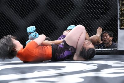 この時間が長く続き高本の両足が外れると、すぐにerikaが正対してヒザ蹴り。距離が開くとerikaが左ストレートを打ち込む。これを被弾した高本だが、すぐにダブルレッグでテイクダウンする。ここも高木が背中を見せて立とうとするerikaのバックに回る。再び高本が四の字ロックでポジションをキープし、パンチを入れてマウントへ。残り10秒で高本の左腕に腕十字を狙うが、ここはラウンド終了となる。