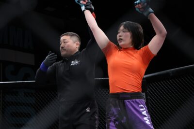 2R、erikaが左ストレートで前に出る。高本が距離を詰めて組みつくと、erikaがをケージに押し込む。ここで高木は両差しからバックに回ると、erikaの体を持ち上げてテイクダウンする。これでerikaが頭をマットに打ち付け、高木がバックマウントについてパンチを入れるとerikaはディフェンスすることができず、レフェリーが試合を止めた。