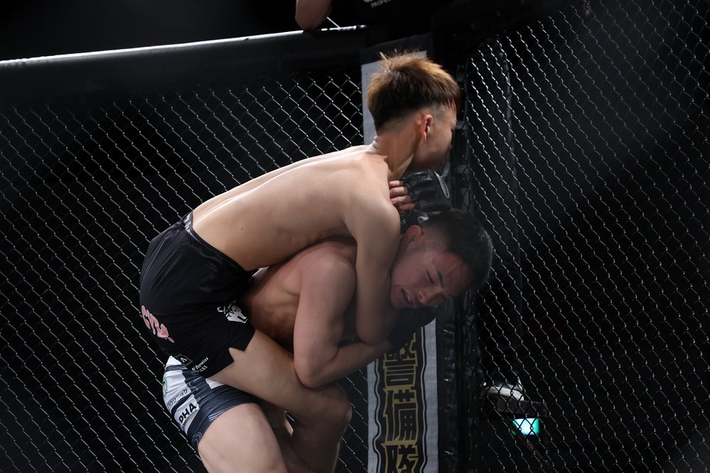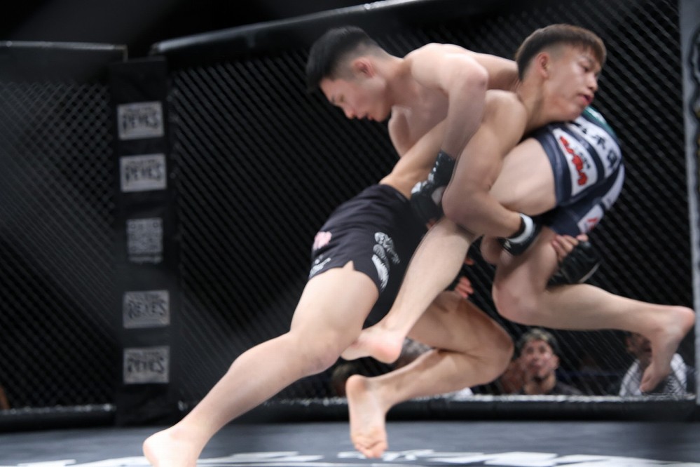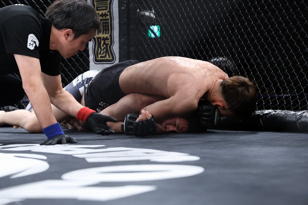 福元は距離を詰めると、中島は右に回って右ローを蹴る。一旦距離を取り、左ジャブを突いてからダブルレッグで飛び込む。ヒザを着いて背を見せた福元に対し、すぐさまバックに回る中島。福元が立ち上がるとバックマウント→オタツロックを整え、首に右腕を回した。福元が前に倒れると体を伸ばして絞め上げ、そのまま絞め落としてバンタム級新人王に輝いた。