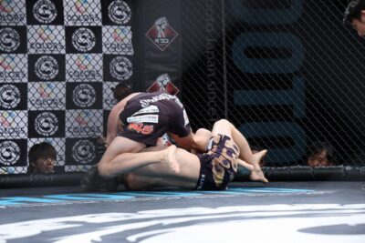 しかし旭那のダブルレッグをスプロールしてバックに回る。左足を差し入れ、旭那を仰向けにさせた。右足も入れてボディトライアングルを整えた黒部がRNCを狙う。旭那も凌ぎ、体を起こして黒部の体勢を崩してからトップに回った。