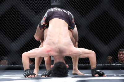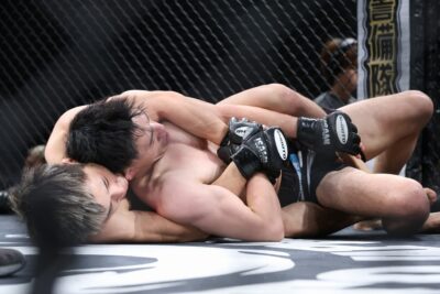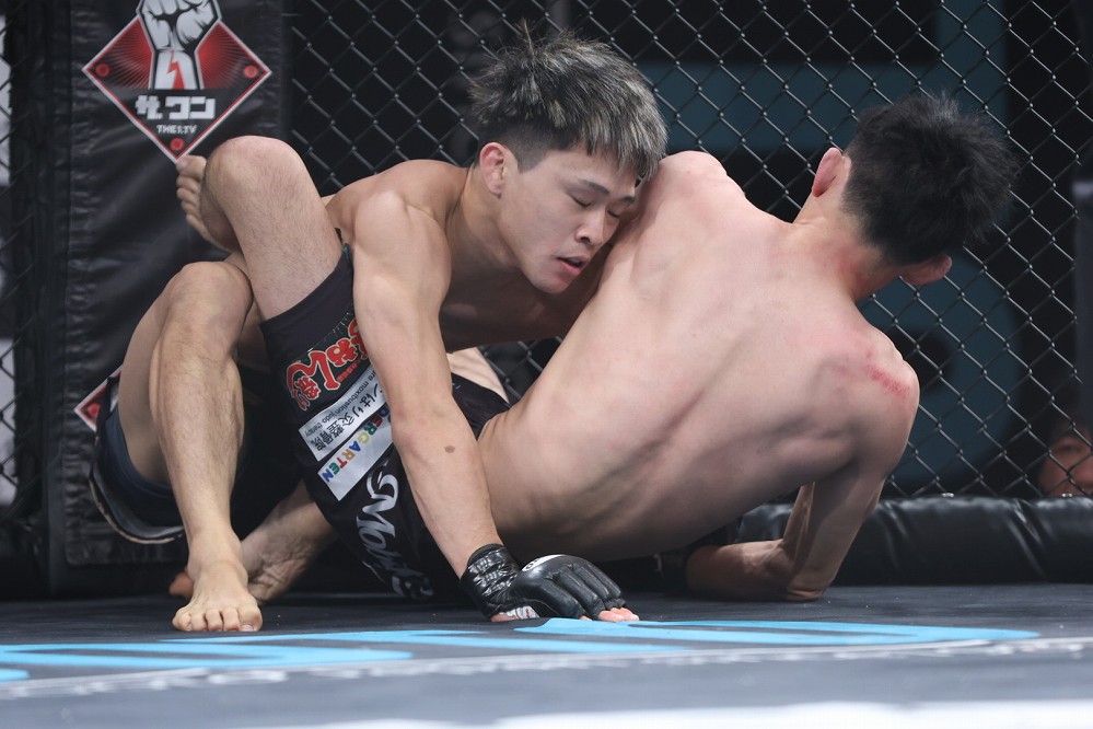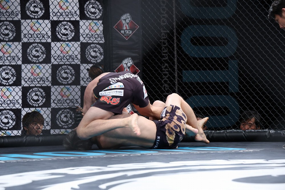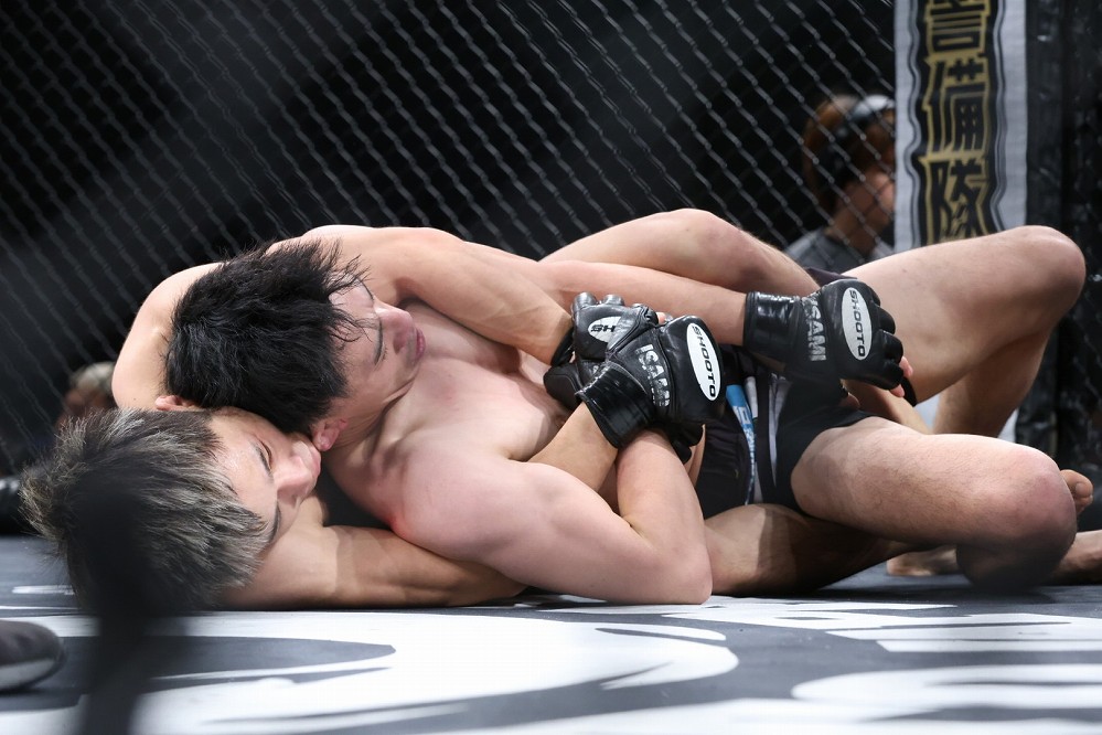 旭那の右足を押さえ、絞め上げる黒部。耐えた旭那が首を抜き、黒部のスイープを防いでパスを狙う。黒部がうつ伏せになるとバックマウントへ。旭那が右腕を首に回すと、そのまま黒部が立ち上がり、ケージに押しつけながらトップを奪う。旭那は下から黒部の左腕を取り、キムラリバーサルでトップに。しかし黒部が上を取り戻す。