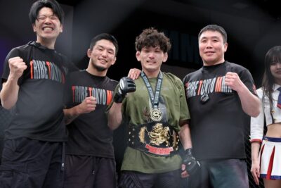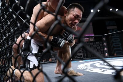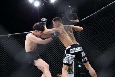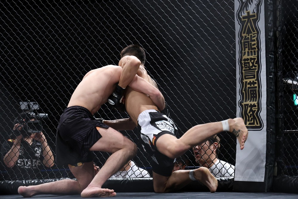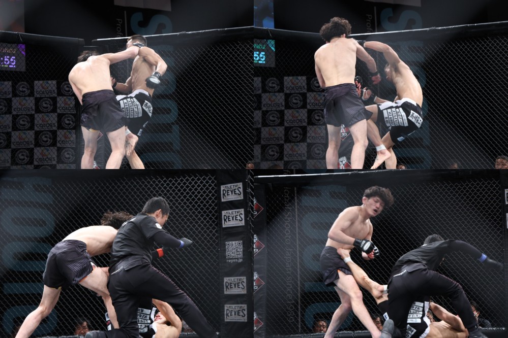 追う川北はダイキの左跳びヒザをブロック。さらに追って、右ストレートを叩き込んだ。この一撃でダイキがダウン。すかさず川北がパウンドを連打する。ケージ際でマウント、バックを狙う川北がパウンドを浴びせると、ダイキはペダラーダを返す。構わず川北は足を潰してパンチを浴びせたところで、初回終了のホーンが鳴った。