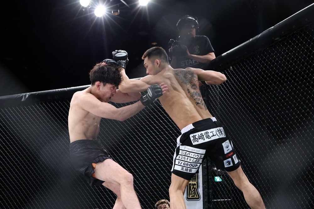 ケージ中央で川北がシングルレッグで組み、ケージに押し込んだ。川北がダブルレッグに切り替えると、ダイキもガブって右ヒジを突き刺す。上下に揺さぶる川北が右腕を差し上げるも、ダイキが離れた。しかし再び川北が組んでいく。両者離れると、距離を詰めてくる川北に対し、ダイキが左縦ヒジを狙う。続くワンツーをかわした川北が右ストレートを当て、さらに組んでケージに押し込んだ。ダイキは左に回って離れる。