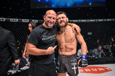 グリップを掴んで頭を突っ込むと、トランブリーも足を組み直す。残り90秒、首を直角気味に畳まれたサンタナがタップした。勝者はヘッドコーチのブロック・ラーソンとともに勝利を喜んだ。