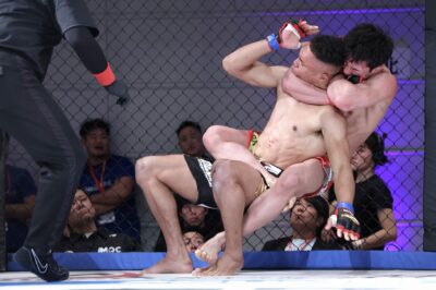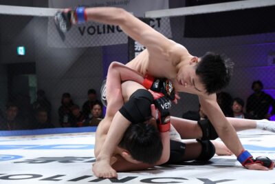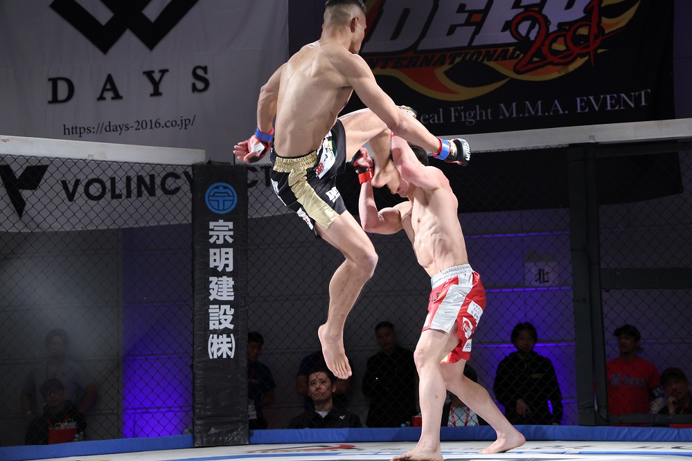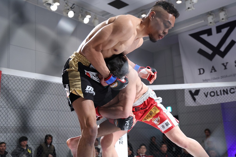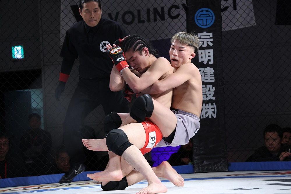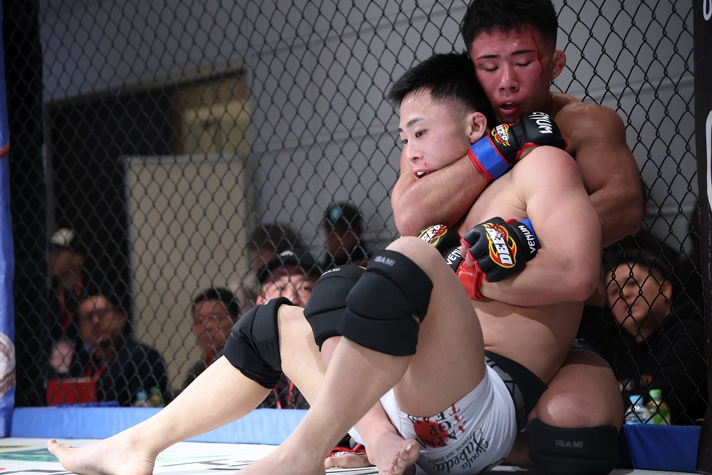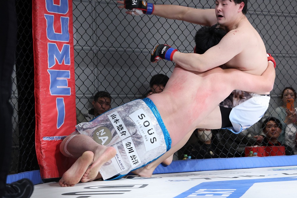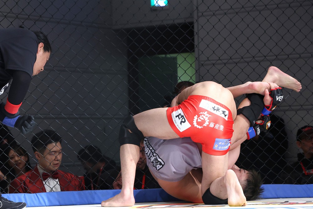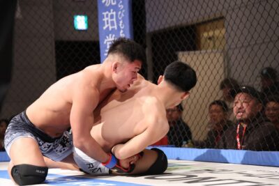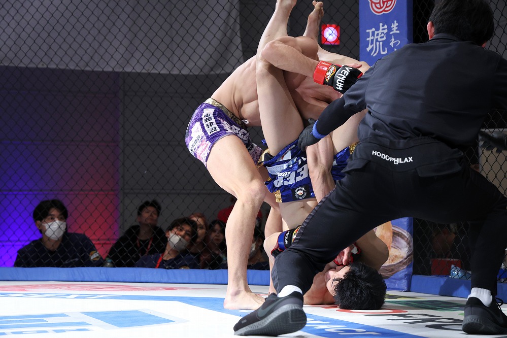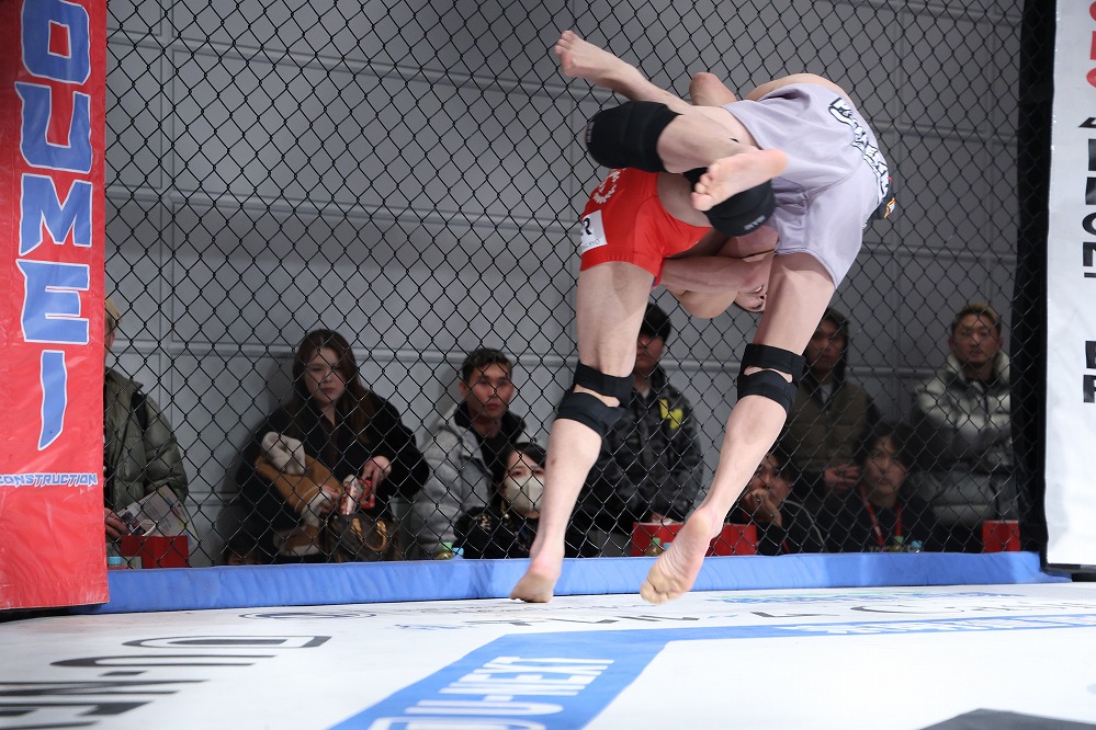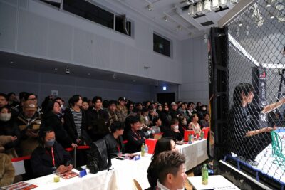 いえば砂被りのケージサイドのみの会場設定での、後楽園ホールは当然として、ニューピアでも聞こえない選手の息遣いが伝わり、メガトン級のファイトではケージにドライブして押し込んだ瞬間、その衝撃音でスタンディング観戦の応援団からどよめきが起こった。コンパクトさ故、普段の大会では体感できない臨場感がガーデンルーム内には確かに存在していた。