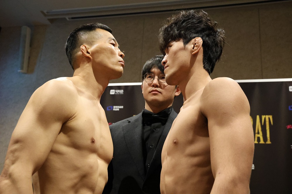 パート01が8試合、パート02が7試合。4階級のタイトル戦が予定されているなか、フェザー級王者パン・ソンヒョクに挑戦予定だったルカス・ベントが2キロ・オーバーに。30分後の再計量でも体重は変わらなかったが、両者の一戦はチャンピオンが勝った場合は王座防衛、ベントが勝利するとノーコンストという変則タイトル戦で実施されることに。